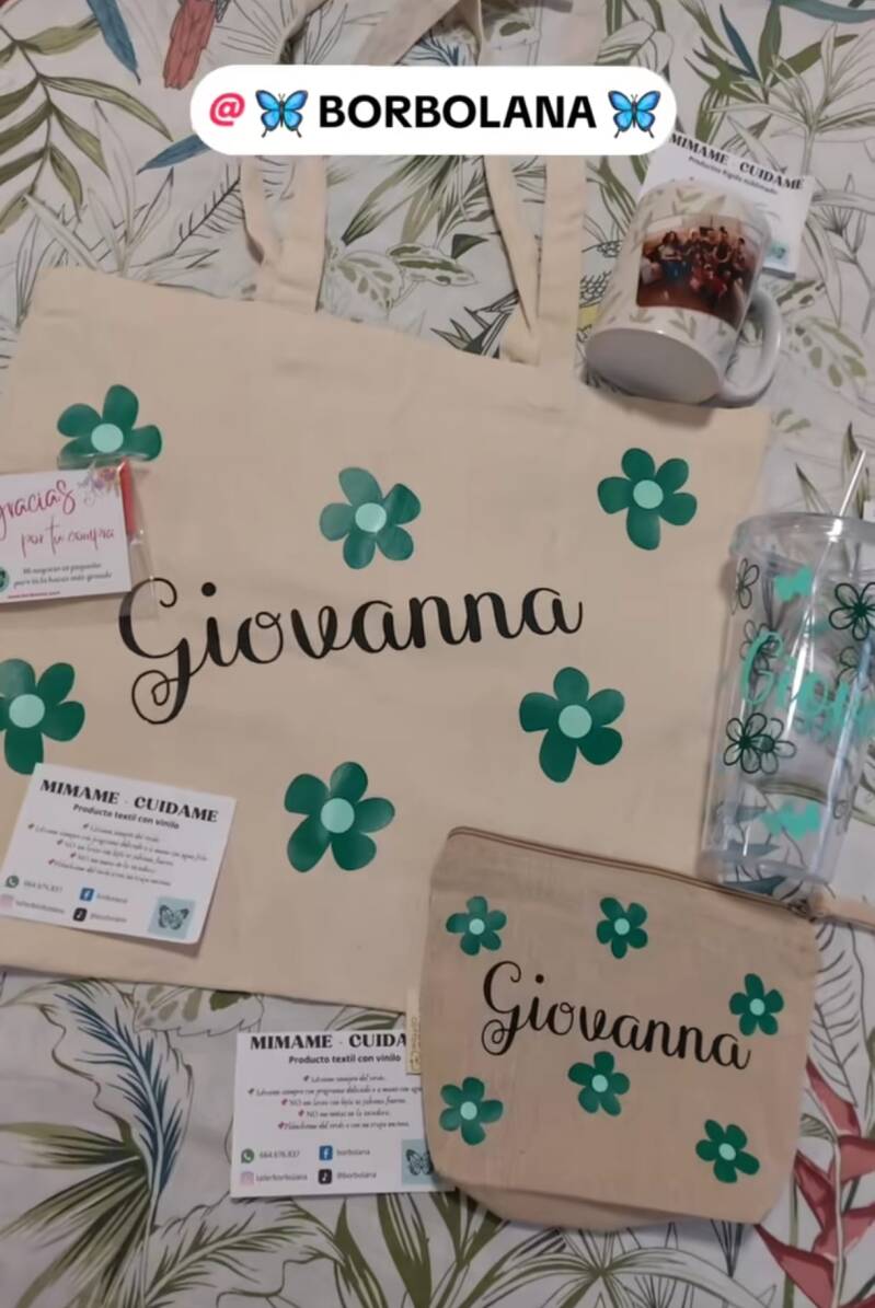 Ana me mandó un paquete precioso: una bolsa de tela personalizada con mi nombre, que uso para la compra, un neceser, una taza con una foto de mi familia y un vaso con pajita, todo de plástico duro y todo con mi nombre. Y no solo los productos estaban cuidados, también el empaquetado: una tarjetita escrita con cariño, unas chuches, todo pensado para que el momento de abrirlo sea una experiencia en sí misma. Y lo fue.